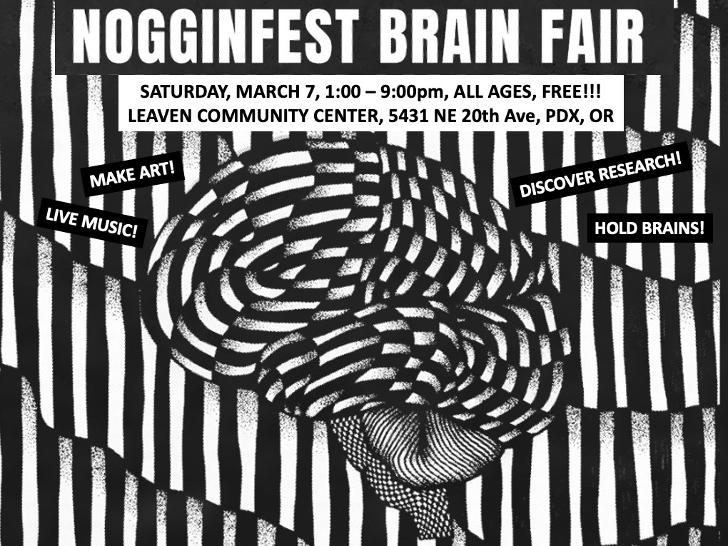 Our innovative graduate and undergraduate art and neuroscience volunteers are Regional Arts & Culture Council (RACC) Juice award-winning developing experts in science communication, synapsing for science, and teaching in schools, theaters, museums, urban and rural communities, homeless youth centers, breweries, correctional facilities, Congress and bike shop pubs! For more information see NOGGIN BLOGGIN.NW Noggin is a locally sourced, 501(c)(3) ALL-VOLUNTEER shoestring nonprofit organization. Your tax-deductible contribution supports the purchase of sheep brains, pipe cleaners, electrodes and clay for innovative, arts-integrated outreach, and helps send volunteers from local universities (including Portland State University, OHSU, and other area institutions) to public school classrooms, conferences and free community events.