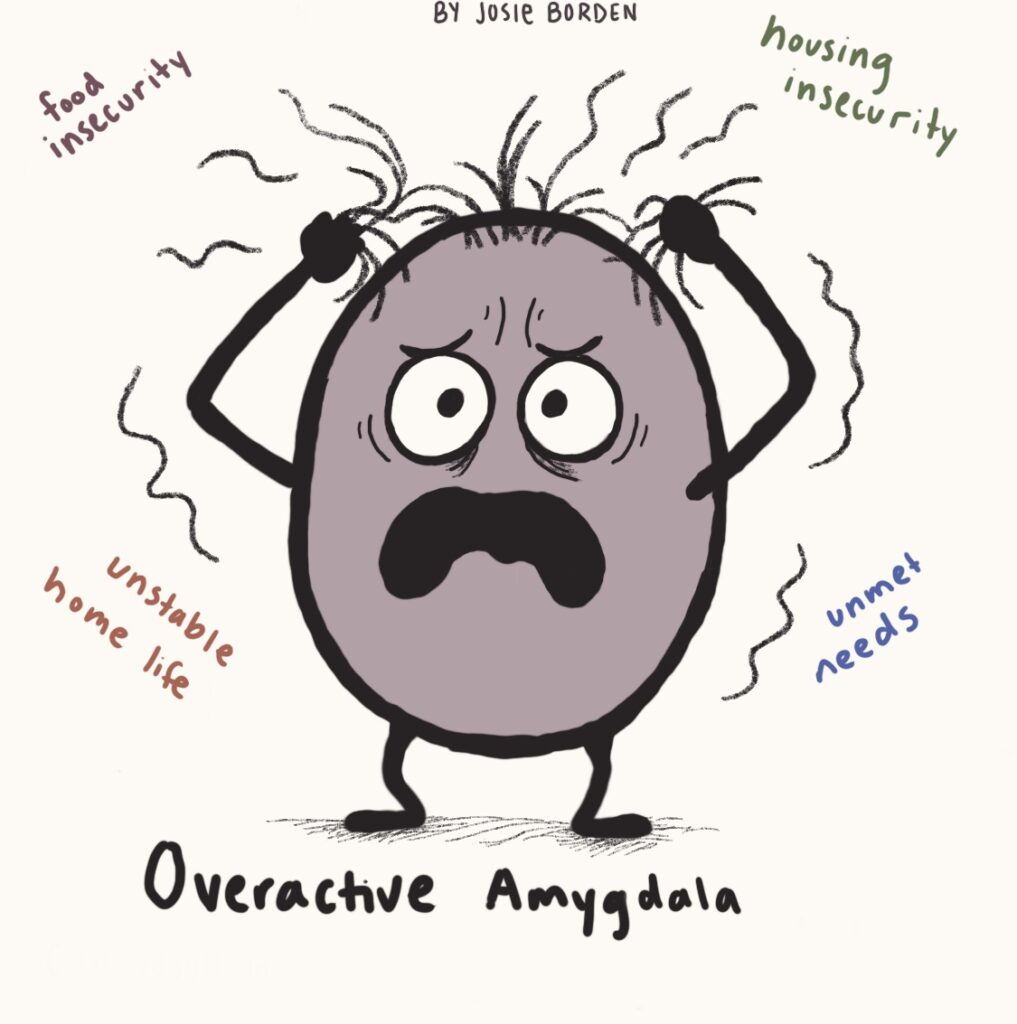 Childhood poverty, socioeconomic disadvantage, and unmet needs have been linked to overactive amygdalas, the part of the brain which is largely responsible for processing emotions like anxiety, fear, and aggression.