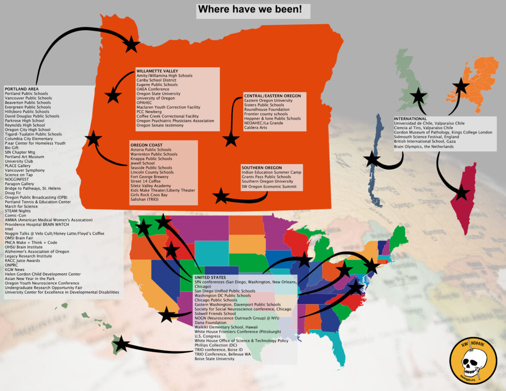 Since 2012 we’ve met over 75,000 K-12 students in Portland, Vancouver, Beaverton, Hillsboro, Gresham, rural Oregon and Washington, San Diego, Chicago and DC public schools! We’ve offered free talks from collaborating students in neuroscience and art, and informed our community about ongoing brain research, training graduates to present their work to a lay audience.